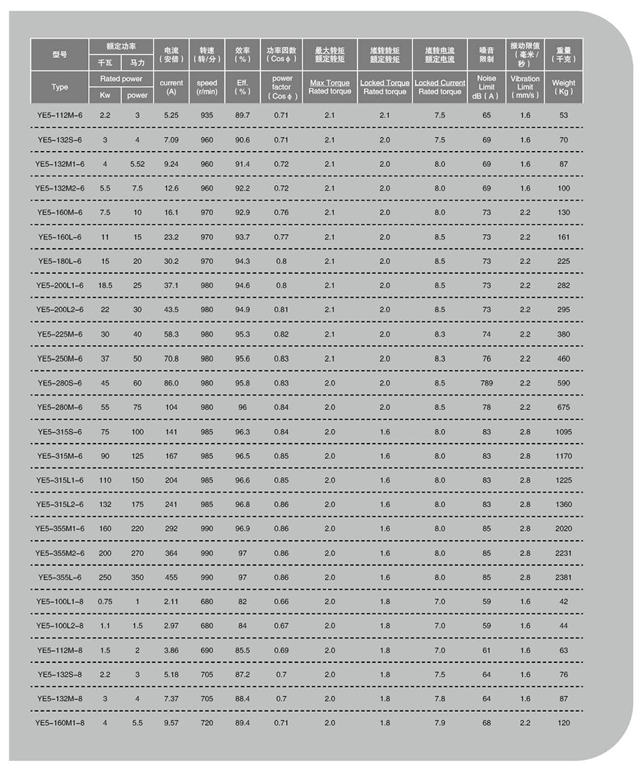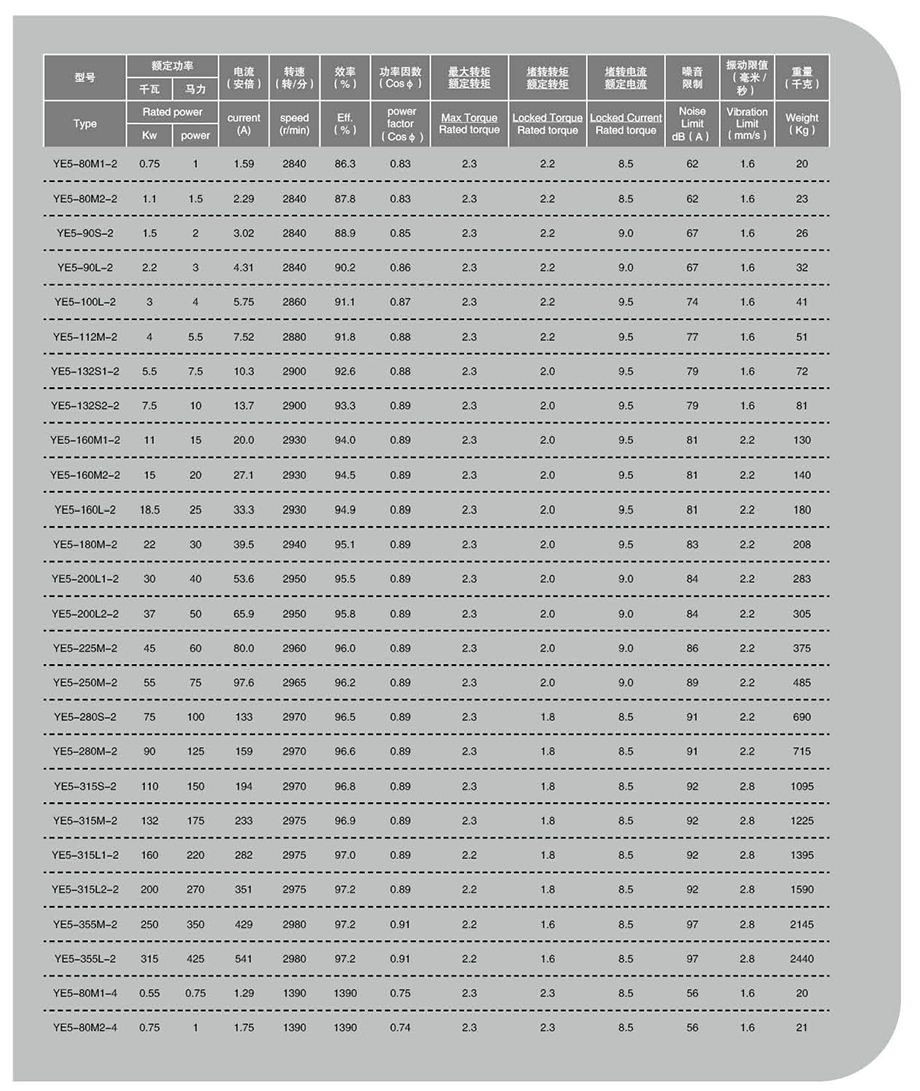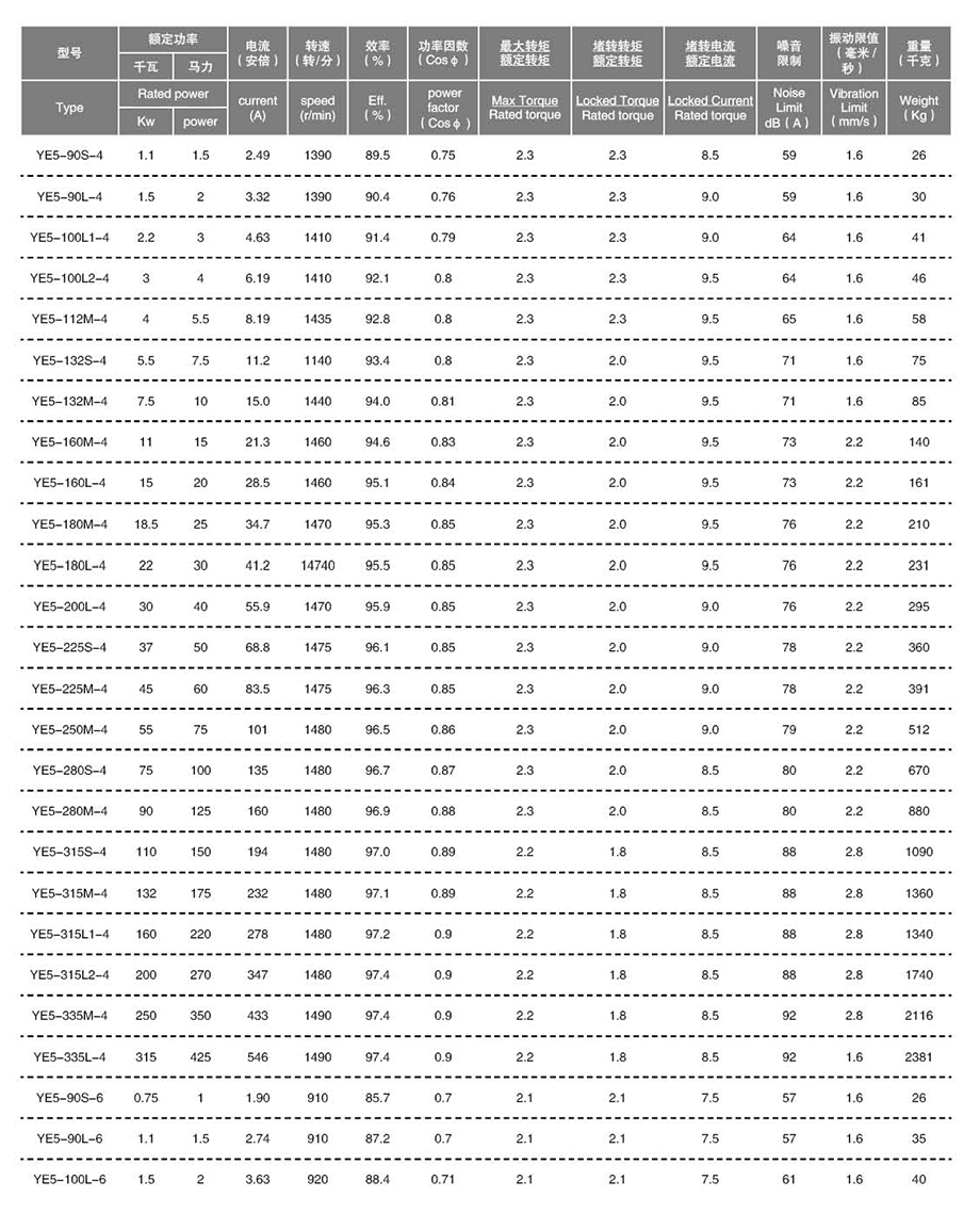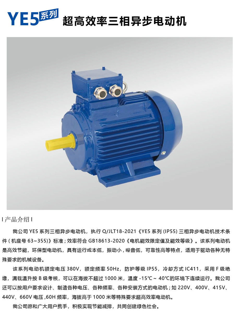 我公司 YE5 系列三相異步電動機,執(zhí)行Q/JLT18-2021《YE5 系列(IP55)三相異步電動機技術(shù)條件(機座號63~355)》標(biāo)準(zhǔn);效率符合 GB18613-2020《電機能效限定值及能效等級》。該系列電動機