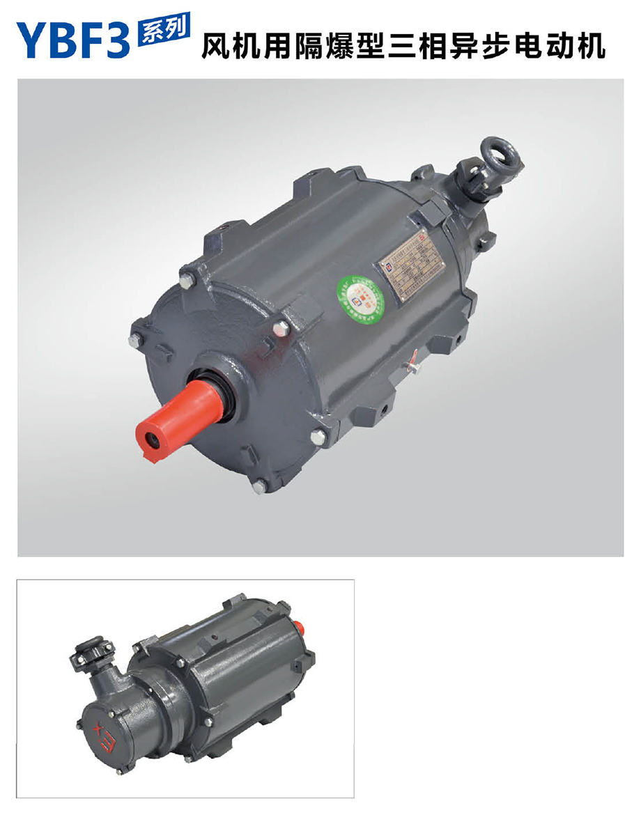 YBF3防爆電機是專為配套隔爆型通風(fēng)風(fēng)機而設(shè)計開發(fā)的新產(chǎn)品,具有體積小、重量輕、效率高、噪聲低、振動小、運行安全可靠、使用維護方便等特點。YBF3防爆電機的功率等級、安裝尺寸符合我國標(biāo)準(zhǔn)和國際電工委員會IEC標(biāo)準(zhǔn),具有當(dāng)代國內(nèi)領(lǐng)先的技術(shù)水平。YBF3系列風(fēng)機用隔爆型三相異步電動機執(zhí)行標(biāo)準(zhǔn)GB3836.1-2010《爆炸性環(huán)境用電氣設(shè)備第2部分:隔爆型“D”MT451-1995煤礦用隔爆型低壓三相異步電動機安全性能通用技術(shù)規(guī)范》。主要性能符合《隔爆型三相異步電動機技術(shù)條件第5部分YBF3系列風(fēng)機用隔爆型三相異步電動機(機座號63-355)》的規(guī)定,防爆標(biāo)志為EXDBIBT4、EXDIBT4(原標(biāo)志為EXD),主要作為風(fēng)機的原動機使用。適用于煤礦井下非采掘面具有甲烷可燃性氣體或煤礦與空氣形成爆炸性氣體環(huán)境的場所。電動機的額定電壓為380V、660V、380/660V、660/1140V,額定頻率50HZ。