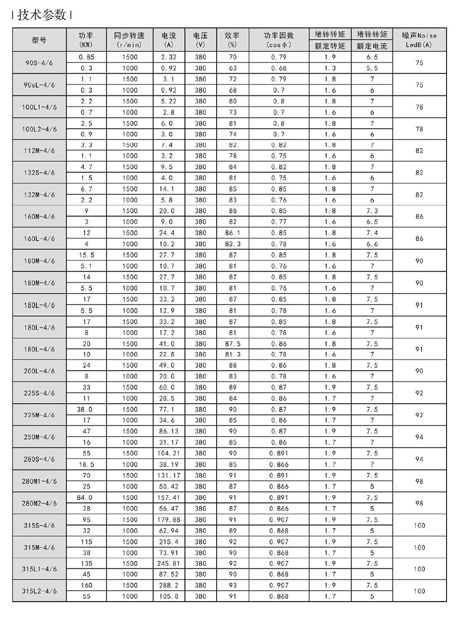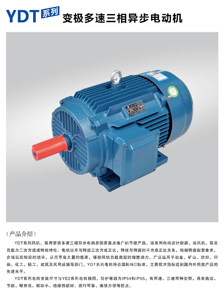 YDT系列風(fēng)機(jī)、泵用變極多速三相異步電動(dòng)是國(guó)家重點(diǎn)推廣的節(jié)能產(chǎn)品。該系列電機(jī)設(shè)計(jì)新穎,按風(fēng)機(jī)、泵類負(fù)載為二次方遞減轉(zhuǎn)矩特性:電機(jī)功率與轉(zhuǎn)速三次方成正比,轉(zhuǎn)矩與轉(zhuǎn)速的平方成正比關(guān)系,根據(jù)轉(zhuǎn)速配套要求,合理匹配相應(yīng)的功率,從而節(jié)省大量的能源,堪稱風(fēng)機(jī)負(fù)載類型的理想動(dòng)力。廣泛運(yùn)用于冶金、礦山、紡織、印染、化工、輕工、建筑及民用設(shè)施等部門。YDT系列電機(jī)符合國(guó)際IEC標(biāo)準(zhǔn),主要技術(shù)指標(biāo)達(dá)到國(guó)內(nèi)外同類產(chǎn)品的先進(jìn)水平。