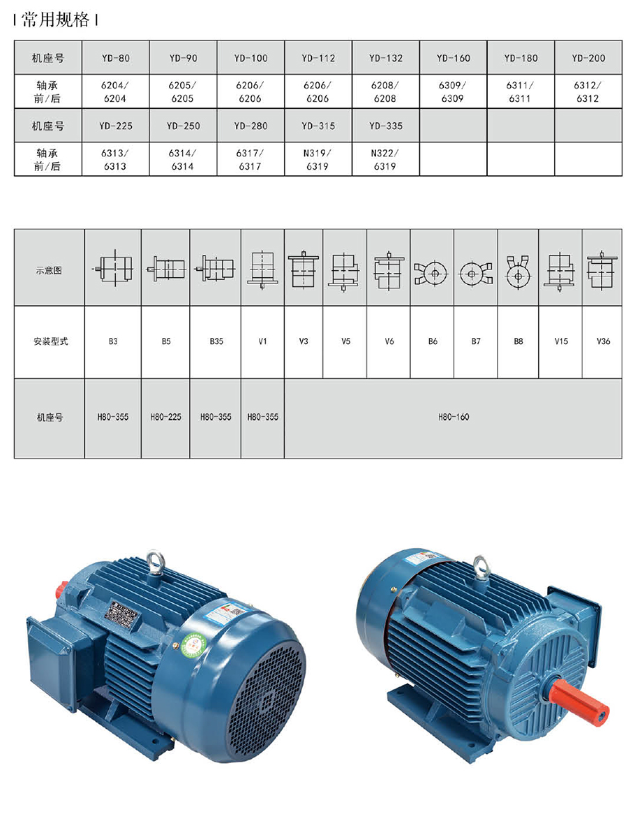 YDT系列電機(jī)安裝尺寸與YE2系列電機(jī)相同,防護(hù)等級(jí)為IP54和IP55,有兩速、三速兩種類型,具有高效節(jié)能、噪音低、振動(dòng)小、絕緣性能好、運(yùn)行可靠、維修方便等優(yōu)點(diǎn)。
